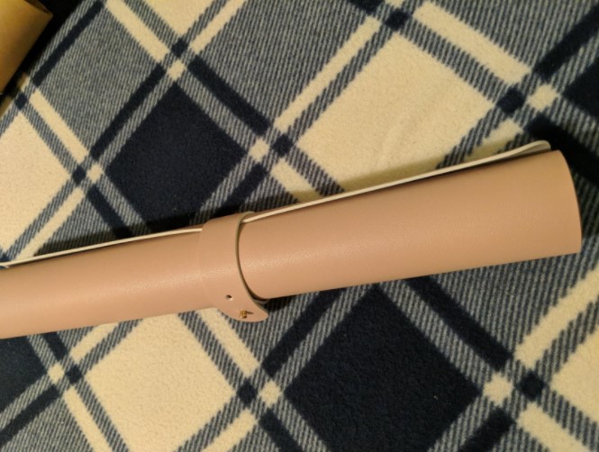 Product is nicely made, and the material seems durable. It covers the surface area needed well, and will work perfectly for it’s intended purpose. However, I’m not happy that the mat arrived folded in half in a box double it’s size. There was no reason it couldn’t have been laid flat inside the box. It’ll possible take some time and effort for it to de-crease and not have a hump down the middle to be a workable writing space.