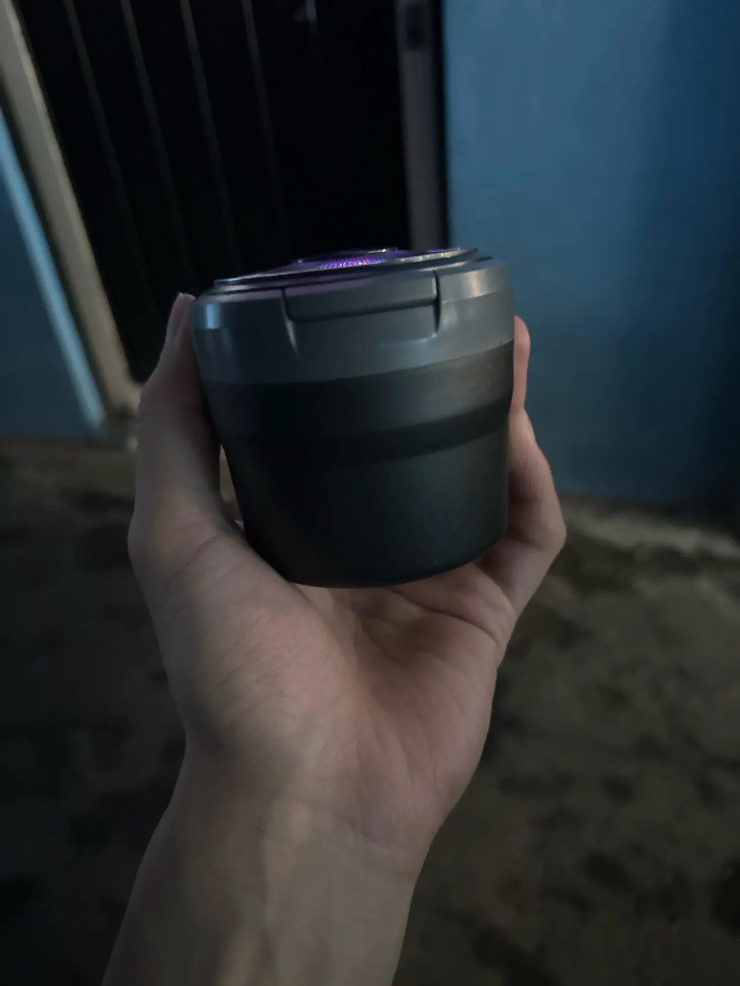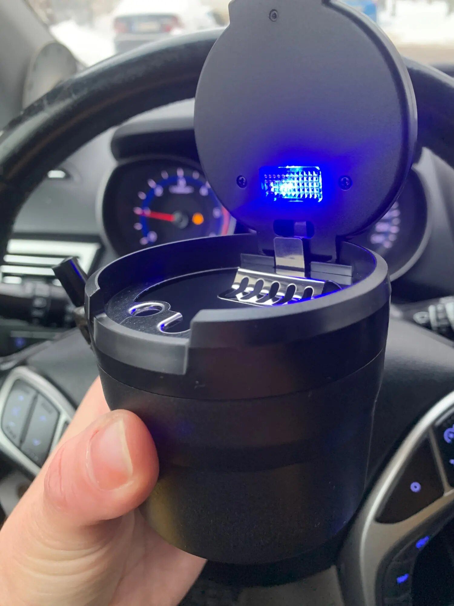I purchased this for travel purposes, especially for use in the backseat where ashing can be messy due to the different window shape. This container fits perfectly in a cupholder, and the LED light is a fantastic feature for visibility in the dark. Opted for the blue variant, and it's exactly as described—a handy solution for minimizing ash messes on the go. It's compact, lightweight, and of good quality.